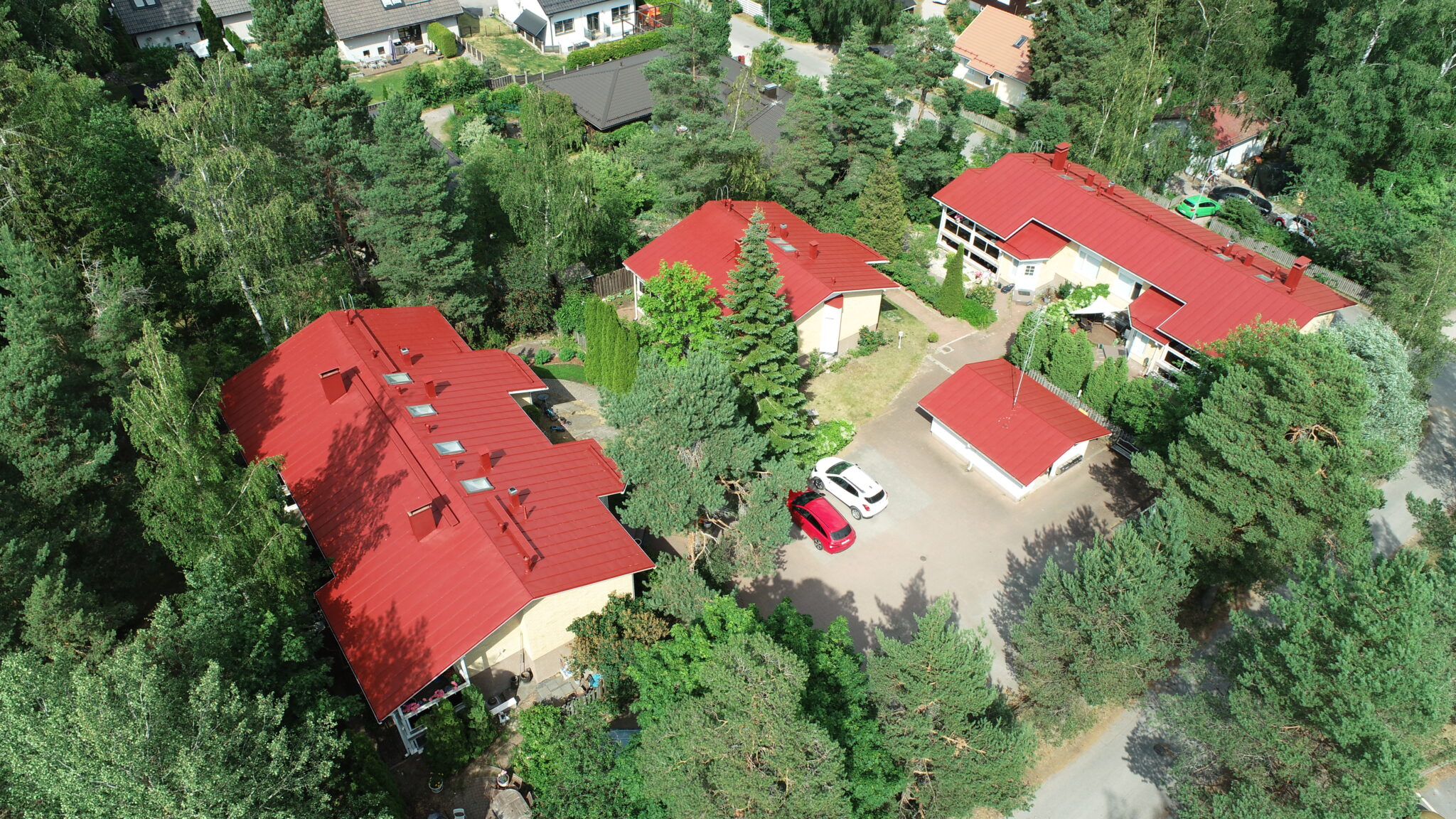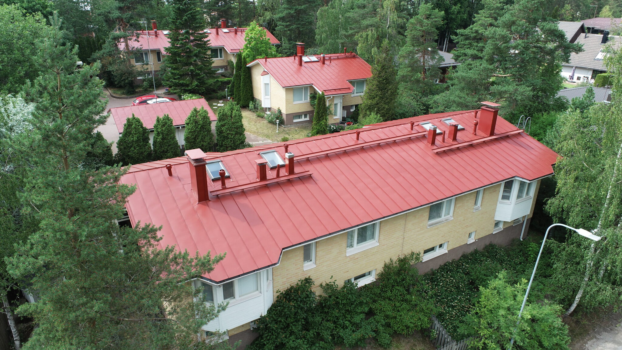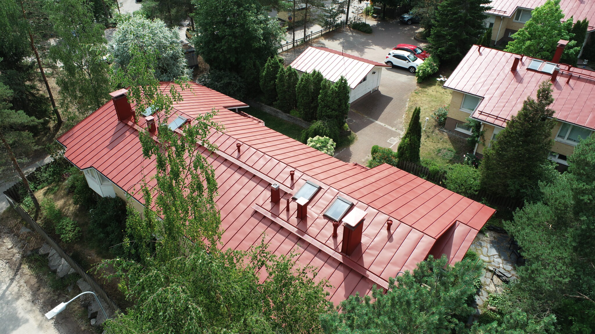 Tässä kohteessa dokumentointi painottuu toteutuneisiin kuviin. Kuvissa näkyy maalattu pinta ja yleisilme työn aikana ja sen jälkeen. RR29-sävy tuo kattoon selkeän ja viimeistellyn ilmeen.